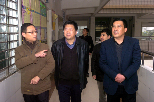 段校長向市文明辦劉主任(右一)、市教育局黃局長(左一)介紹學(xué)校文明單位創(chuàng)建情況