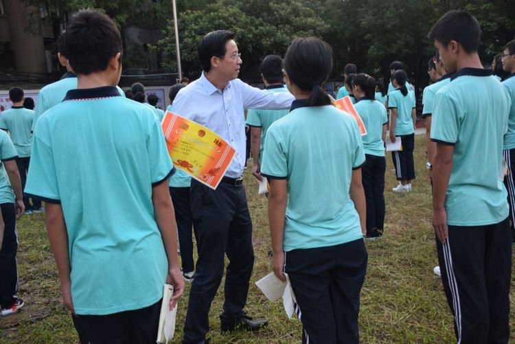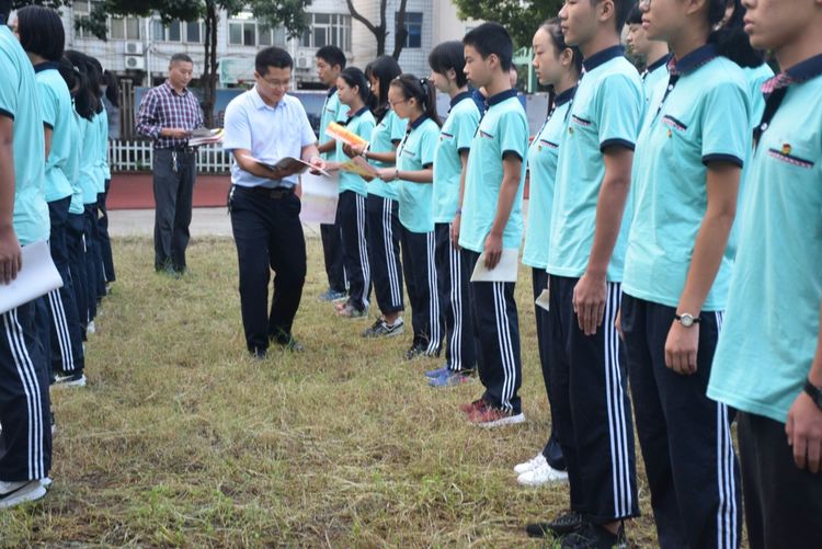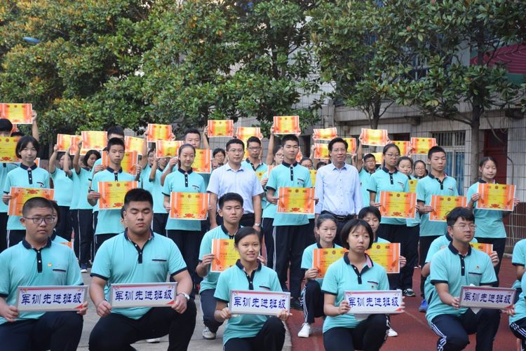 李校長代表學校,給高一軍訓中的優(yōu)秀班級和學員們頒獎。