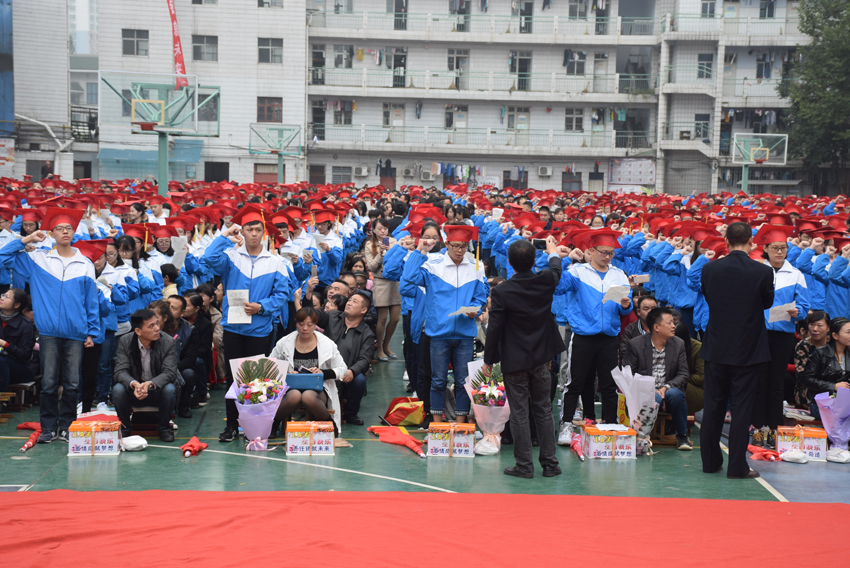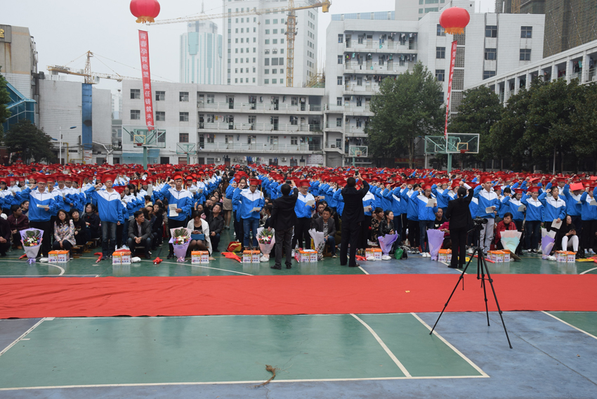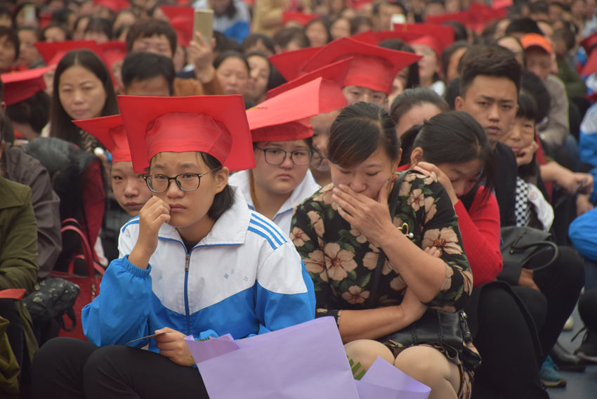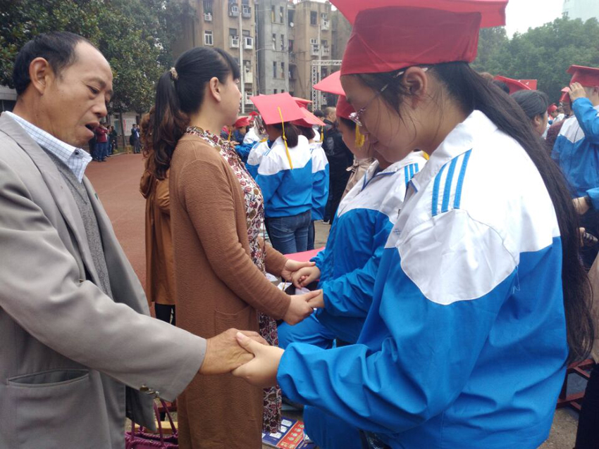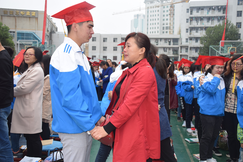高三(20)班王子琪同學(xué)的現(xiàn)場(chǎng)發(fā)言——《感恩的心》將儀式推向了高潮。她選取了日常生活中父母呵護(hù)孩子的典型事例,有常年如一日給孩子送飯的,有父母生病瞞著孩子的,有高考一直守在考場(chǎng)外的,個(gè)個(gè)感人至深。講著講著,家長(zhǎng)們已是熱淚盈眶,學(xué)生更是淚流滿面。1