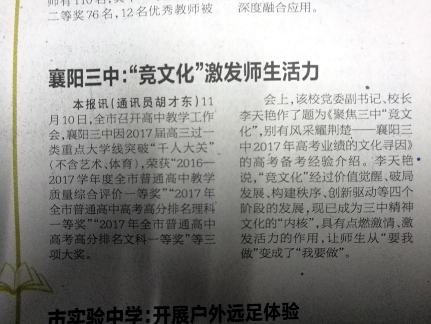 會(huì)上,該校黨委副書記、校長(zhǎng)李天艷作了題為《聚焦三中“競(jìng)文化”,別有風(fēng)采耀荊楚——襄陽(yáng)三中2017年高考業(yè)績(jī)的文化尋因》的高考備考經(jīng)驗(yàn)介紹。李天艷說(shuō),“競(jìng)文化”經(jīng)過(guò)價(jià)值覺醒、破局發(fā)展、構(gòu)建秩序、創(chuàng)新驅(qū)動(dòng)等四個(gè)階段的發(fā)展,現(xiàn)已成為三中精神文化的“內(nèi)核”,具有點(diǎn)燃激情、激發(fā)活力的作用,讓師生從“要我做”變成了“我要做”。