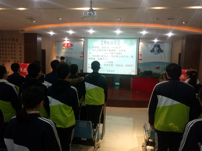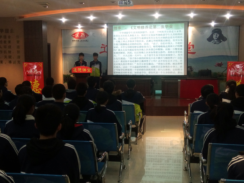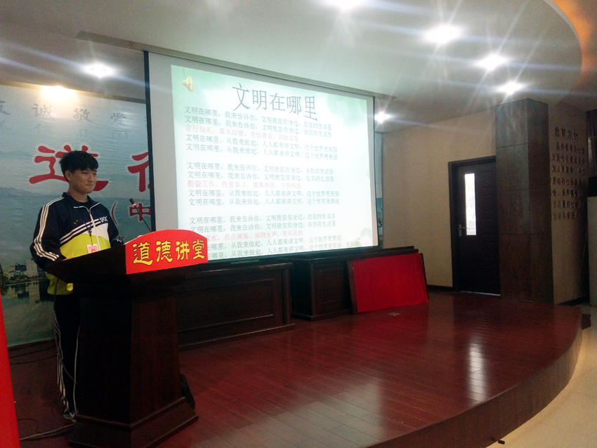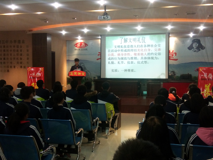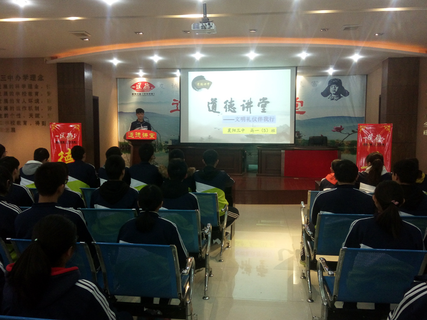 2017年11月25日下午,襄陽(yáng)三中道德講堂在學(xué)校道德講堂活動(dòng)室開(kāi)講,本期道德講堂的主題是“文明禮儀伴我行”,主講人為高一(5)班班主任汪金順老師,活動(dòng)第一個(gè)環(huán)節(jié)唱歌曲,同學(xué)們起立合唱溫暖而熟悉的歌曲《文明在哪里》。隨后,主持人聲情并茂介紹了文明禮儀的知識(shí),講述道德故事,全體同學(xué)誦讀了經(jīng)典,并寫下感悟和承諾,最后,學(xué)生們?cè)诹粞园迳嫌帽愫炠N拼成了“文明”,并表示要將“文明”留在心中,讓文明禮儀隨行。