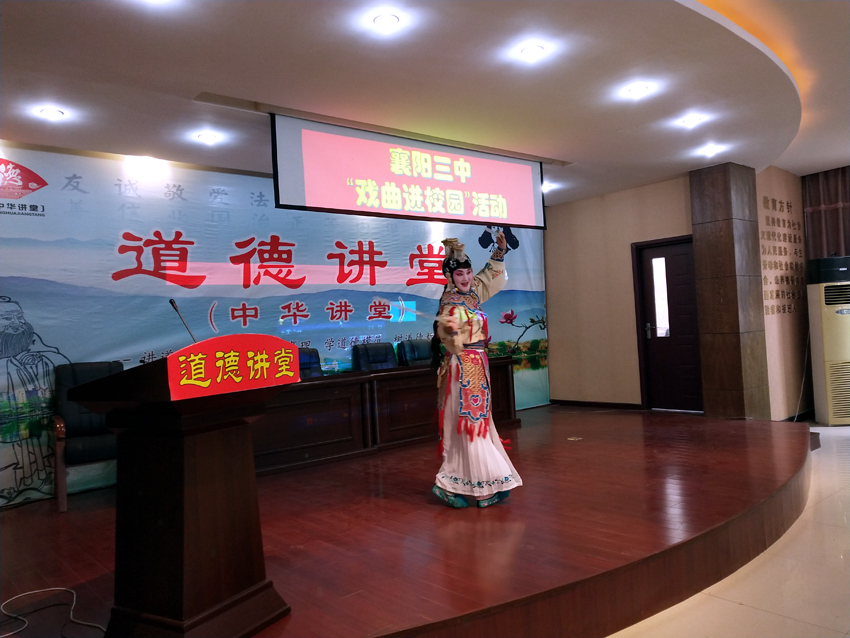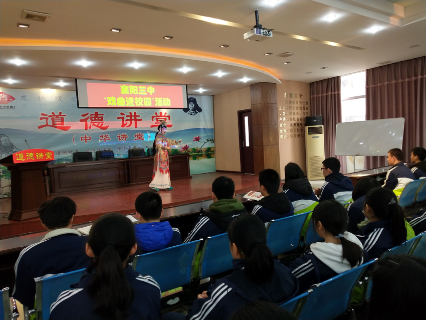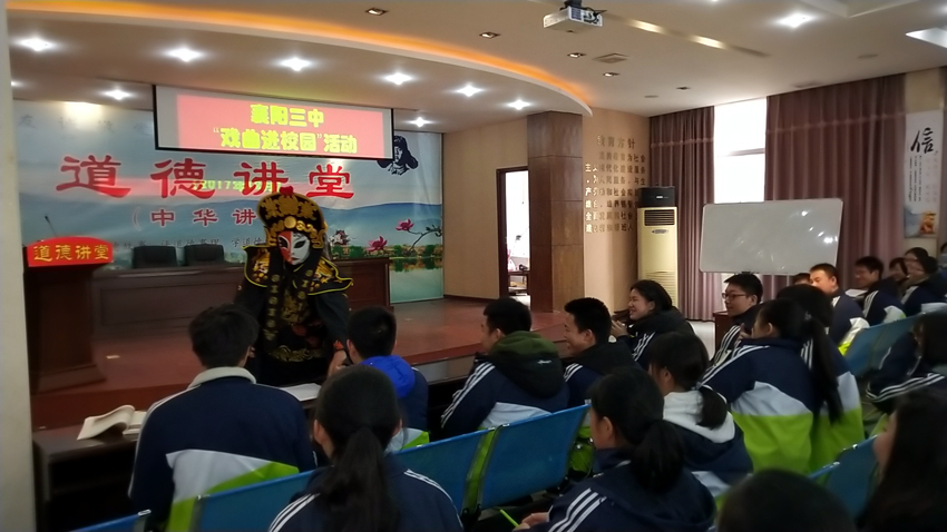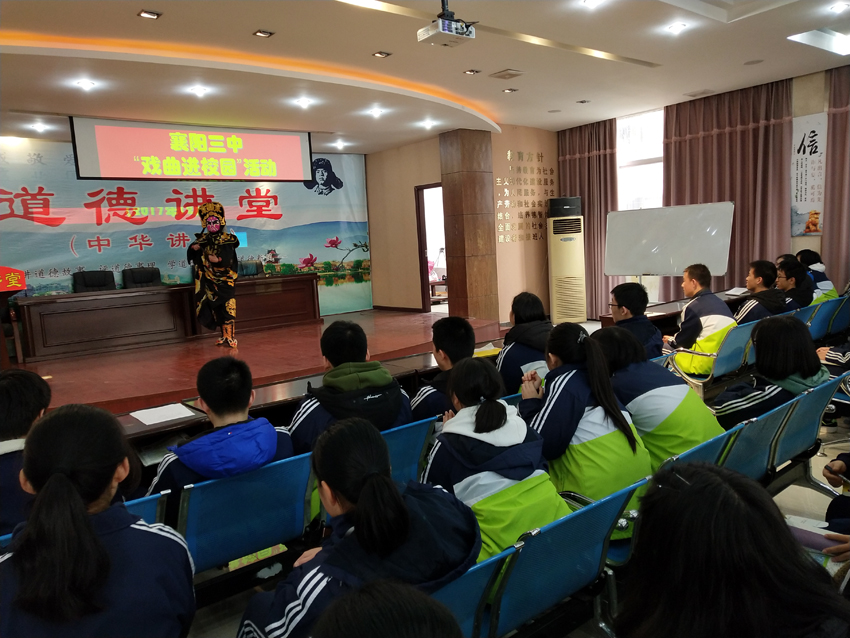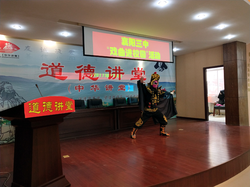 2017年12月28日,襄陽市藝術(shù)劇院的領(lǐng)導(dǎo)和演員來到我校道德講堂開展“戲曲進(jìn)校園”活動?;顒邮紫扔蓜≡侯I(lǐng)導(dǎo)講述戲曲作為中華傳統(tǒng)藝術(shù)文化的悠久歷史和所擁有的豐富內(nèi)容,學(xué)生們聽得津津有味。隨后,變臉、霸王別姬、猴戲等表演者分別登場,為我校學(xué)生帶來了精彩的曲藝表演,獲得了到場學(xué)生的一陣陣掌聲和歡呼聲。