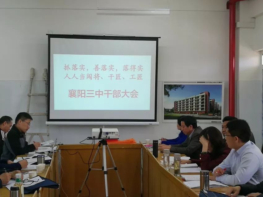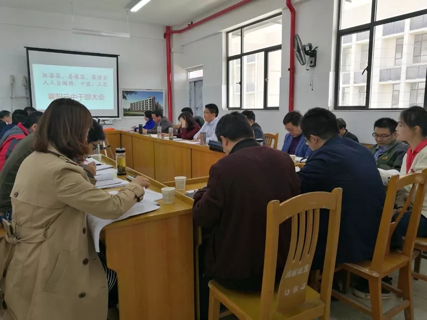 為了進(jìn)一步貫徹落實黨的十九大精神,深入推進(jìn)“作風(fēng)落實年”活動,奮力書寫教育領(lǐng)域“奮進(jìn)之筆“、”得意之筆“,4月9日,襄陽三中在東津新校區(qū)召開了干部大會。與會的有學(xué)校領(lǐng)導(dǎo)班子成員、中層干部和級部主任,會議由學(xué)校黨委副書記、紀(jì)委書記陳斌主持。