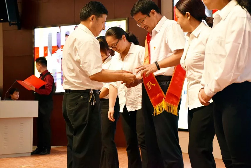 學(xué)校領(lǐng)導(dǎo)班子為受表彰員工佩戴綬帶,頒發(fā)榮譽(yù)證書。一條綬帶、一張證書飽含著園丁們的心血和汗水,彰顯了三中人淡泊名利、追求卓越的價(jià)值取向。
