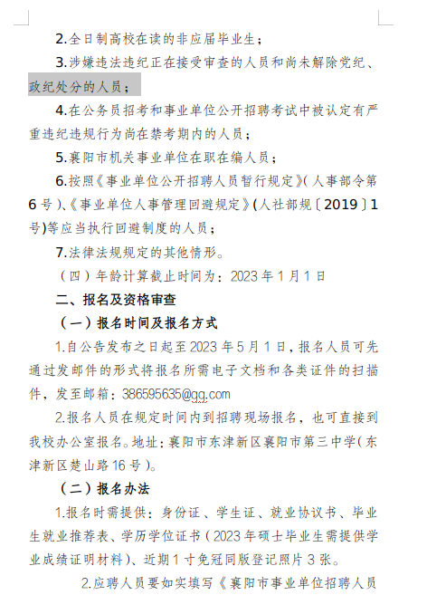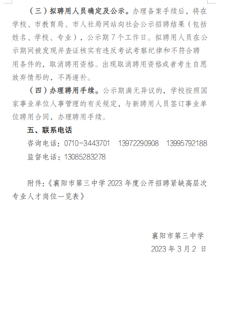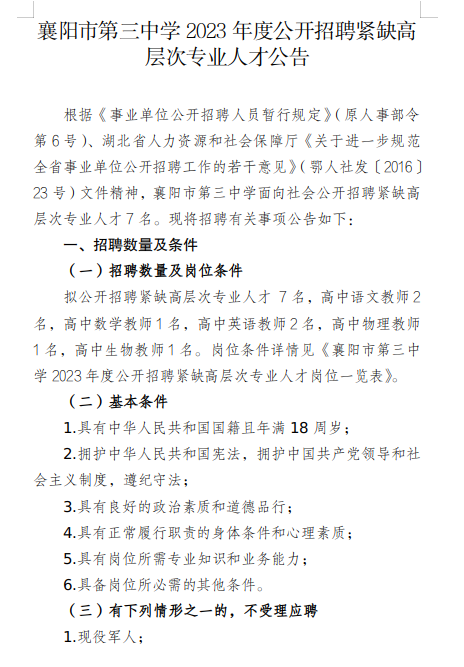襄陽市第三中學(xué)2023年度公開招聘緊缺高層次專業(yè)人才公告
